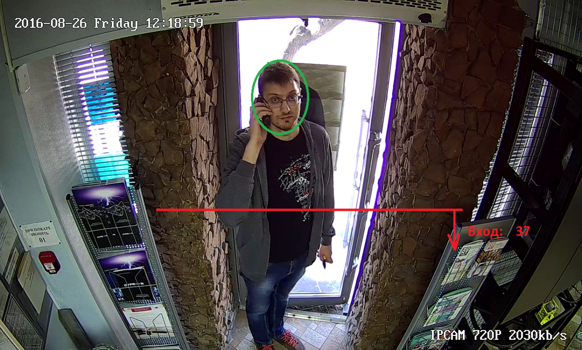 Мы предлагаем старт записи и подсчет входящих посетителей по лицам. Данный вариант наиболее оптимален, поскольку вошедшие люди рано или поздно выйдут из магазина. Если же необходимо рассчитать время пребывания человека в помещении, можно поставить вторую камеру.