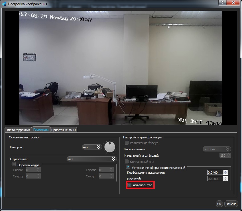 9. По умолчанию масштаб задан равным единице, и также включен «Автомасштаб». Если Вы снимете галочку со строки «Автомасштаб», то можете отдалить или приблизить картинку для более точной настройки изображения с камеры. Но в большинстве случаев этого делать не требуется, и всю работу на себя берет свойство «Автомасштаб».